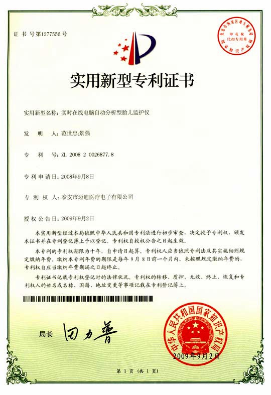 公司研發(fā)的電腦自動分析型胎兒母嬰監(jiān)護儀,獲得國家發(fā)明專利,2011年榮獲國家科技部創(chuàng)新技術產(chǎn)品,該產(chǎn)品解決了婦產(chǎn)科醫(yī)護人員 普遍不會胎兒監(jiān)護圖形分析診斷的困惑,極大促進了胎兒監(jiān)護的臨床應用與發(fā)展!開創(chuàng)了中國胎兒監(jiān)護自動分析新時代!市場前景極其廣闊!