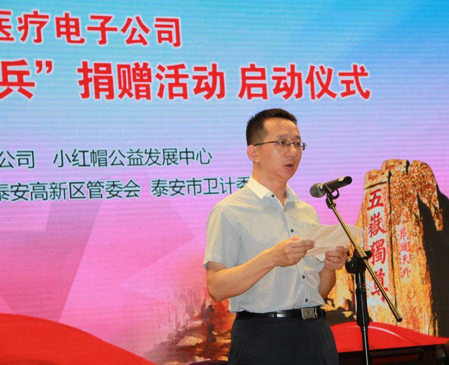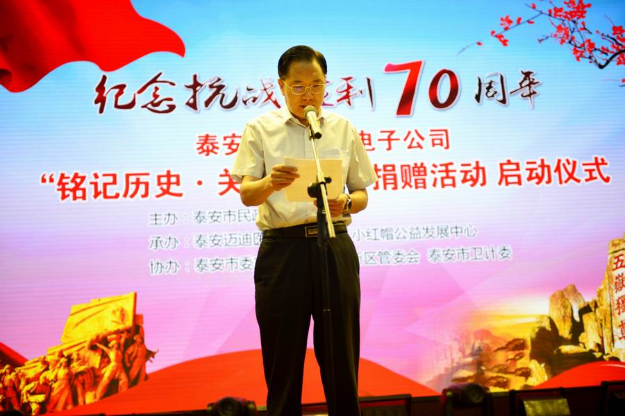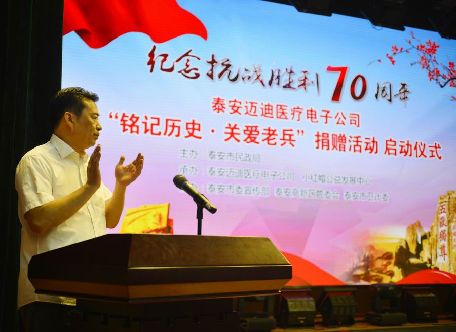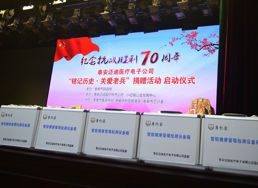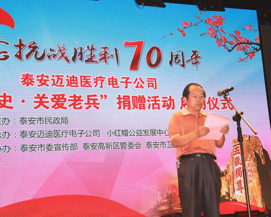 為紀(jì)念抗日戰(zhàn)爭暨世界反法西斯戰(zhàn)爭勝利70周年,弘揚(yáng)抗戰(zhàn)精神,褒揚(yáng)抗戰(zhàn)老戰(zhàn)士,泰安市邁迪醫(yī)療電子有限公司發(fā)展不忘回報社會,在泰安市民政局的指導(dǎo)下,拿出遠(yuǎn)程家庭健康檢測產(chǎn)品,為抗戰(zhàn)老兵送愛心、送健康。 2015年8月24日,在泰安市傳媒集團(tuán)演播大廳,泰安邁迪公司紀(jì)念抗戰(zhàn)勝利70周年“銘記歷史·關(guān)愛老兵”捐贈活動啟動儀式,在溫暖、熱烈的氣氛下進(jìn)行。泰安市副市長徐恩虎、泰安市民政局局長孫蘭俊、副局長董峰、泰安邁迪公司董事長范世忠、泰安市小紅帽公益發(fā)展中心主任張煥慶,以及縣市區(qū)、景區(qū)優(yōu)撫單位代表、社會愛心人士和廣大志愿者200余人參加。市委副秘書長于文龍主持儀式。