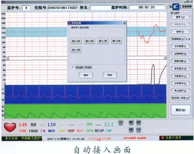 床邊機(jī)一開機(jī)進(jìn)入監(jiān)護(hù)狀態(tài),孕婦的住院號(hào)、姓名及各種監(jiān)護(hù)信息自動(dòng)的傳到中央監(jiān)護(hù)主機(jī)上,自動(dòng)啟動(dòng)中央監(jiān)護(hù)工作站開始監(jiān)護(hù),監(jiān)護(hù)結(jié)束后自動(dòng)存儲(chǔ)監(jiān)護(hù)信息, 實(shí)現(xiàn)了自動(dòng)監(jiān)護(hù)無人值班,極大方便了臨床應(yīng)用。