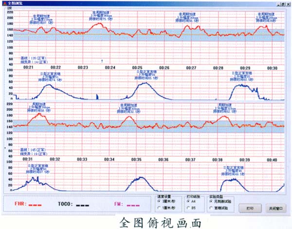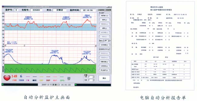 在監(jiān)護(hù)中對胎心率基線、細(xì)變異大小、加速、各種減速及胎動(dòng)的變化進(jìn)行實(shí)時(shí)在線分析,并將分析結(jié)果顯示在屏幕上,監(jiān)護(hù)結(jié)束時(shí)對所有的監(jiān)護(hù)信息進(jìn)行綜合分析,給出監(jiān)護(hù)診斷結(jié)果及胎兒評分供臨床參考,使得每個(gè)婦產(chǎn)科大夫都能輕松進(jìn)行胎兒監(jiān)護(hù)圖形分析和診斷。